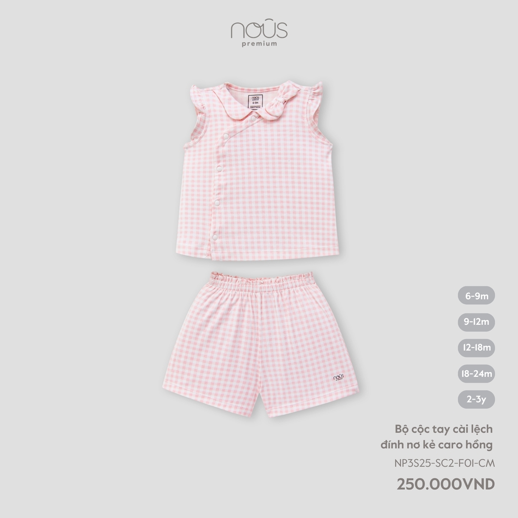 Bộ cộc tay cài lệch đính nơ kẻ caro hồng