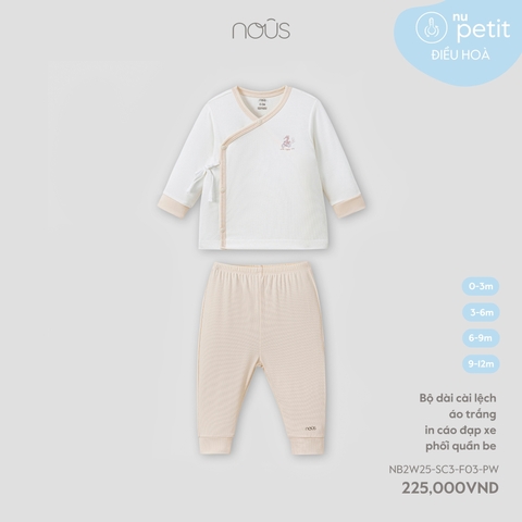 Bộ dài cài lệch áo trắng in cáo đạp xe phối quần be