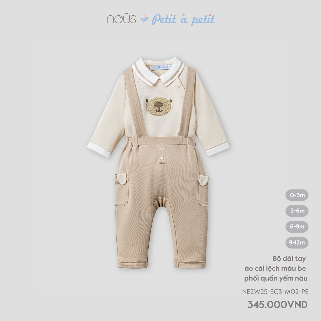 Bộ dài tay áo cài lệch màu be phối quần yếm nâu