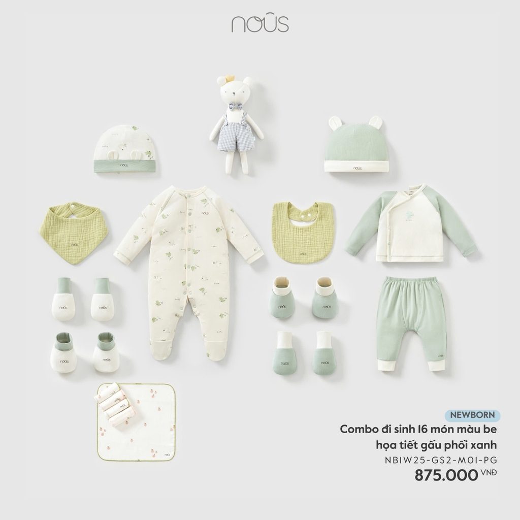 Combo đi sinh 16 món màu be họa tiết gấu phối xanh